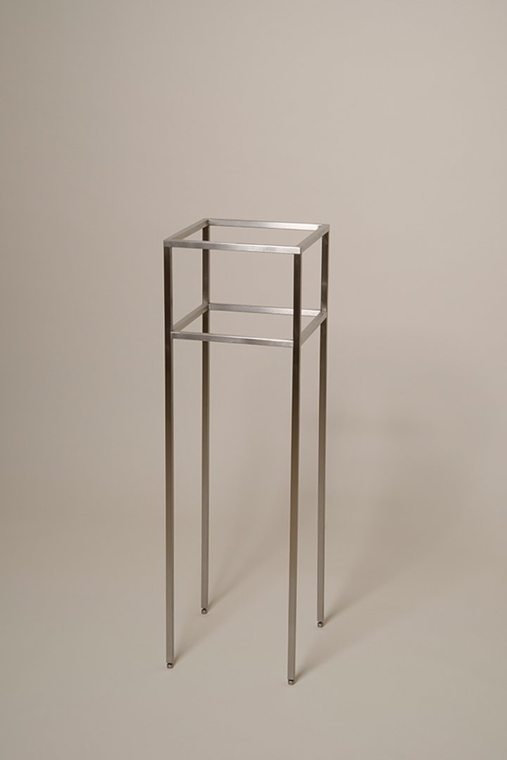 This stainless steel and stone side table was designed to explore the contrast between modern, light stainless steel profiles and heavy, irregular marble and stones. Available also with Metamorphic rocks, which are neither granite nor marble, are created by large-scale tectonic events such as continental collision or subduction. Formed in Precambrian times, these stones emerged when continents shaped and early life evolved.